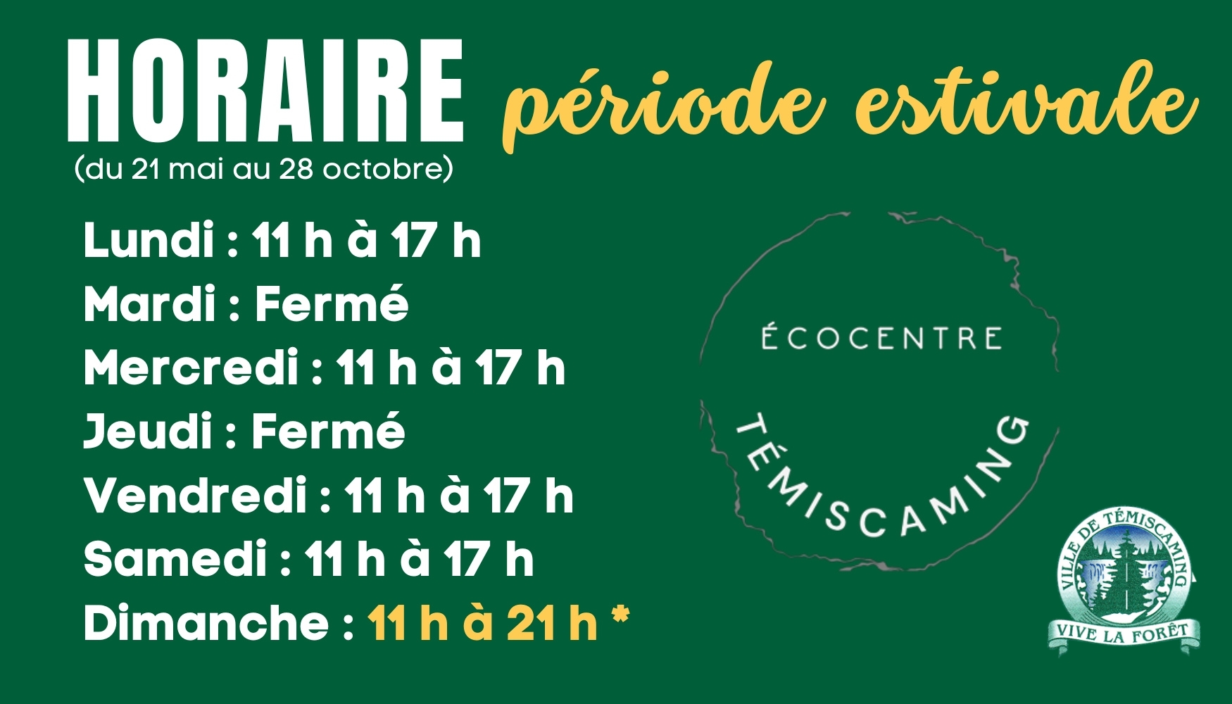 SUMMER HOURS - ECOCENTER | The hours of operation of the Ecocentre will be modified as of Sunday, May 21, 2023 for the summer period.