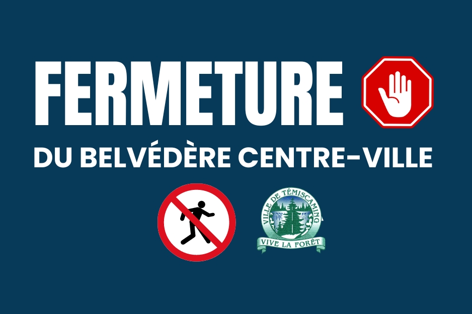 Temiscaming, July 24, 2023 - The Town of Temiscaming wishes to advise the public of the closure of the downtown lookout located behind the Recreation Center for safety reasons. It is strictly forbidden to enter the fenced-in area. Please use caution and respect the signs installed on site. The Town requests the cooperation of citizens and visitors.