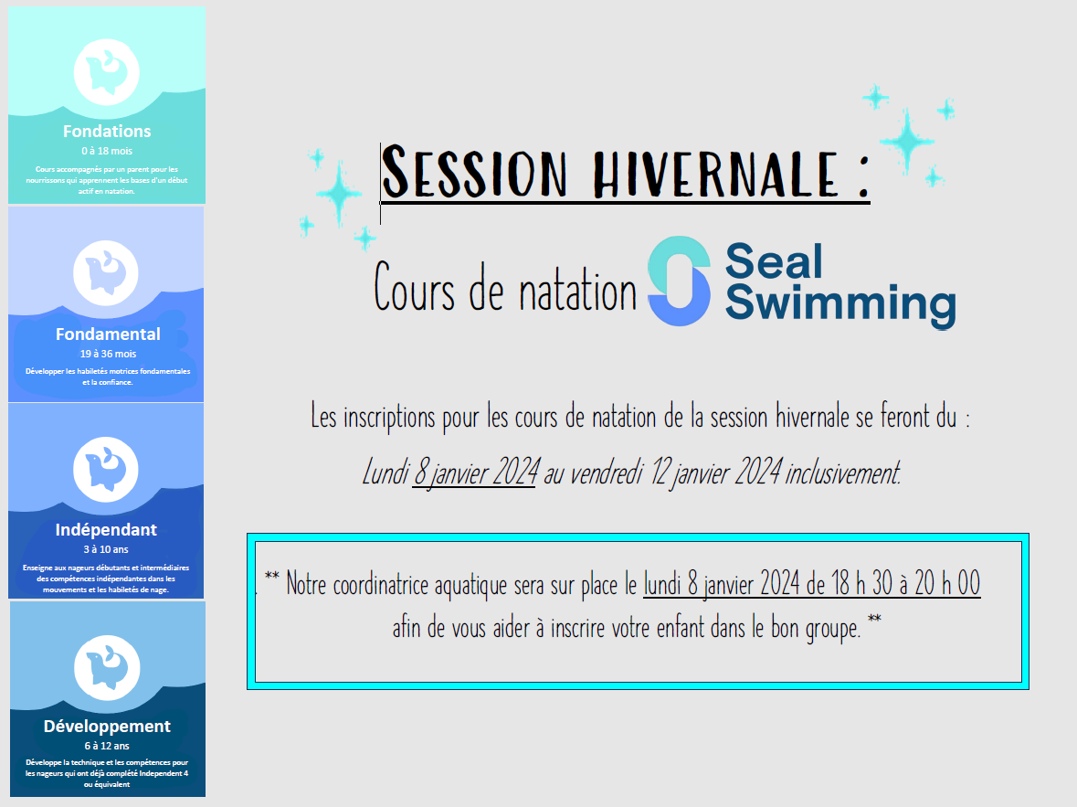 Registration for winter session swimming lessons will take place from Monday, January 8 to Friday, January 12, 2024 inclusively.
