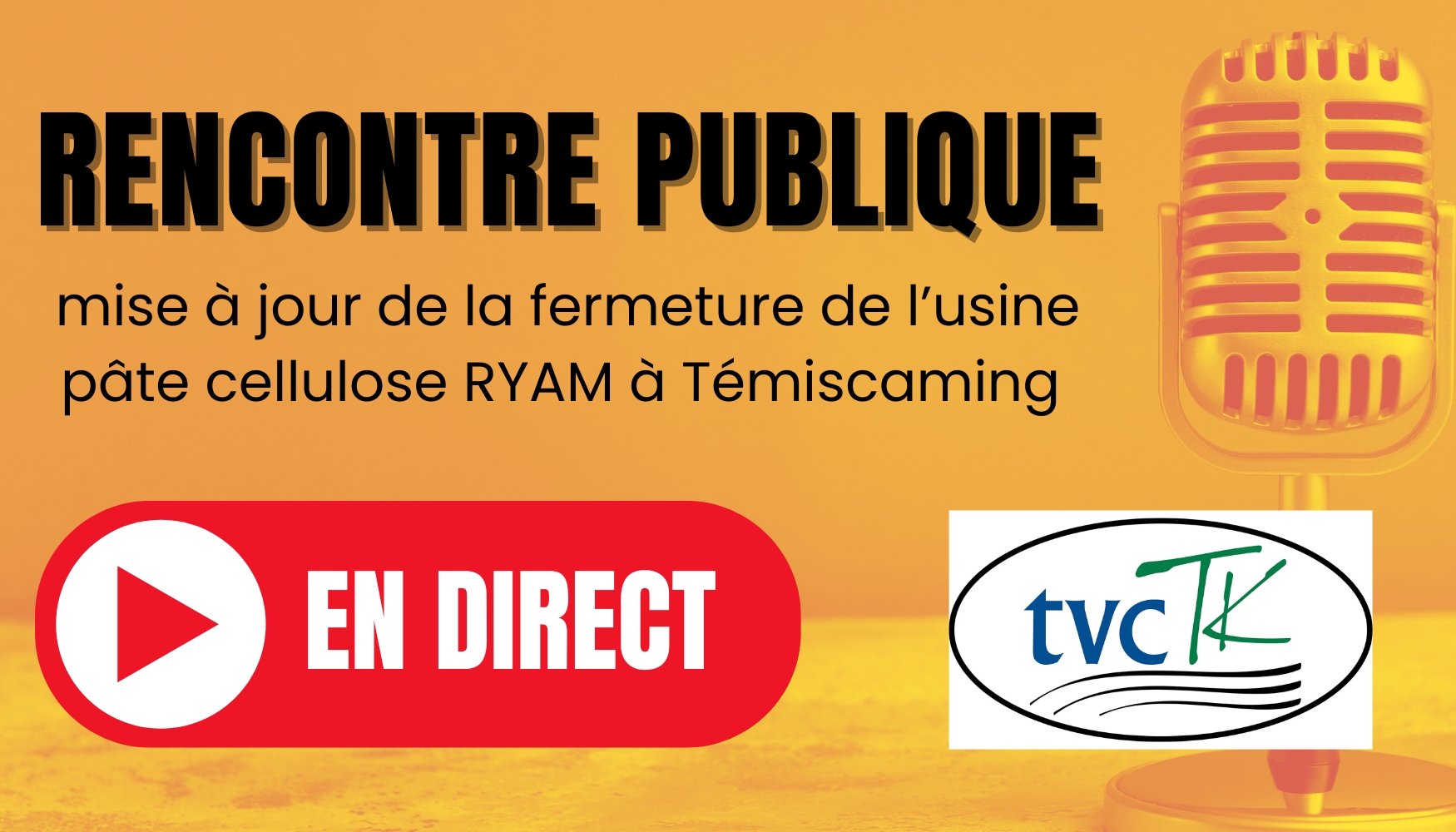 Many of you have asked for it. You can follow the public meeting organized by the Town of Temiscaming and the Municipality of Kipawa this evening at 7 p.m. on the update concerning the closure of the RYAM cellulose pulp mill in Témiscaming. Many thanks to TVCTK community television.