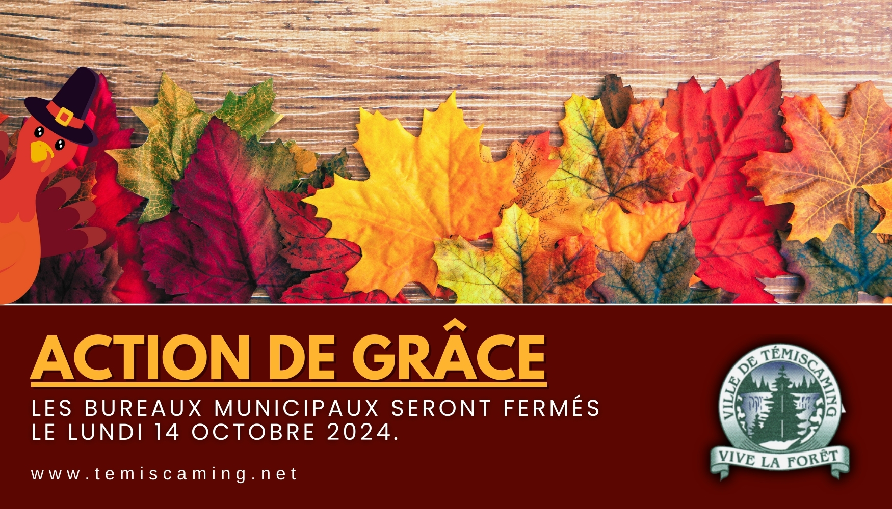 Please be advised that municipal offices will be closed on October 14, 2024, in observance of Thanksgiving. This includes: