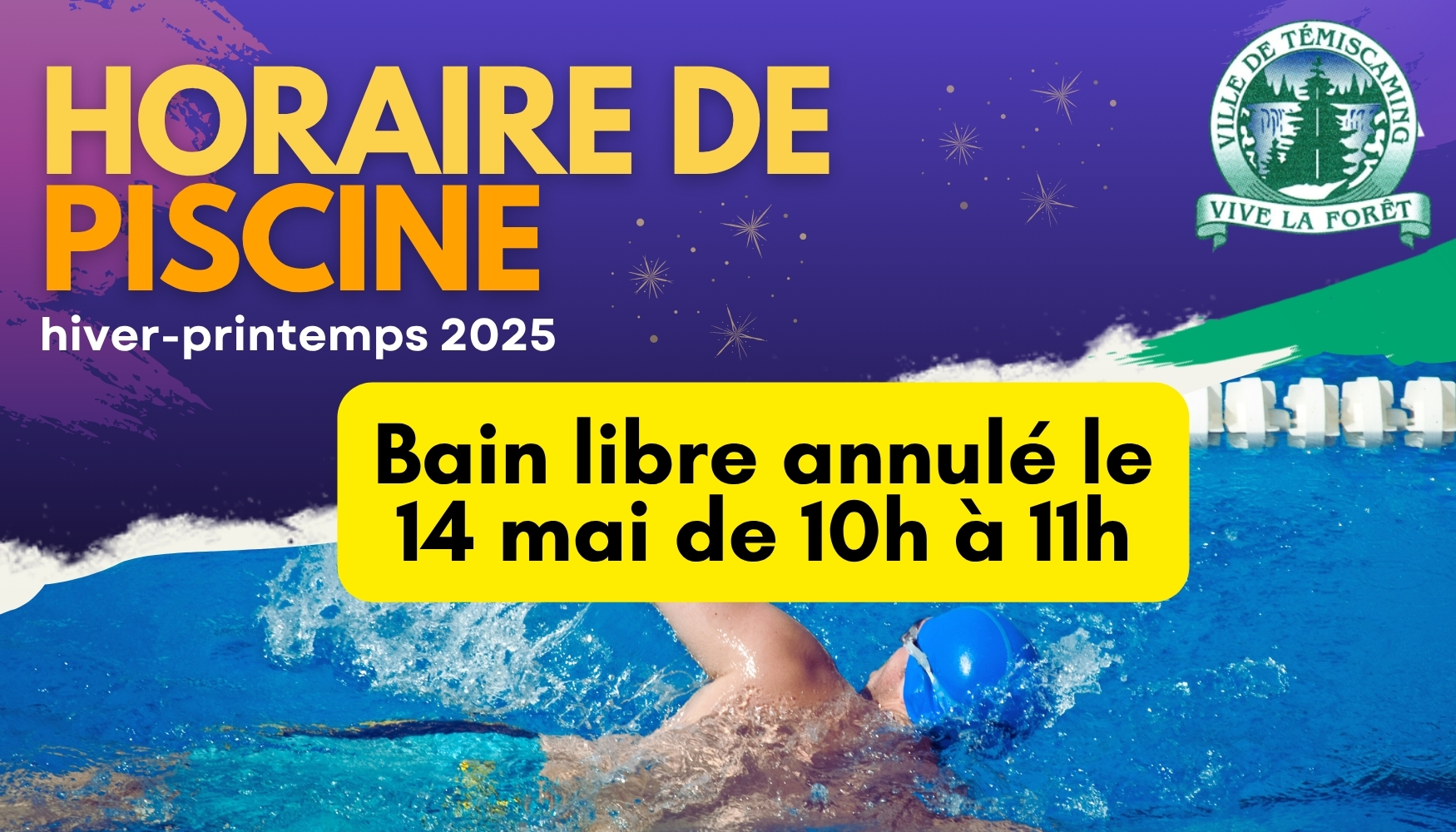 Please note that the scheduled open swim on Wednesday, May 14, 2025, from 10 a.m. to 11 a.m., at the Centre, will be exceptionally cancelled.