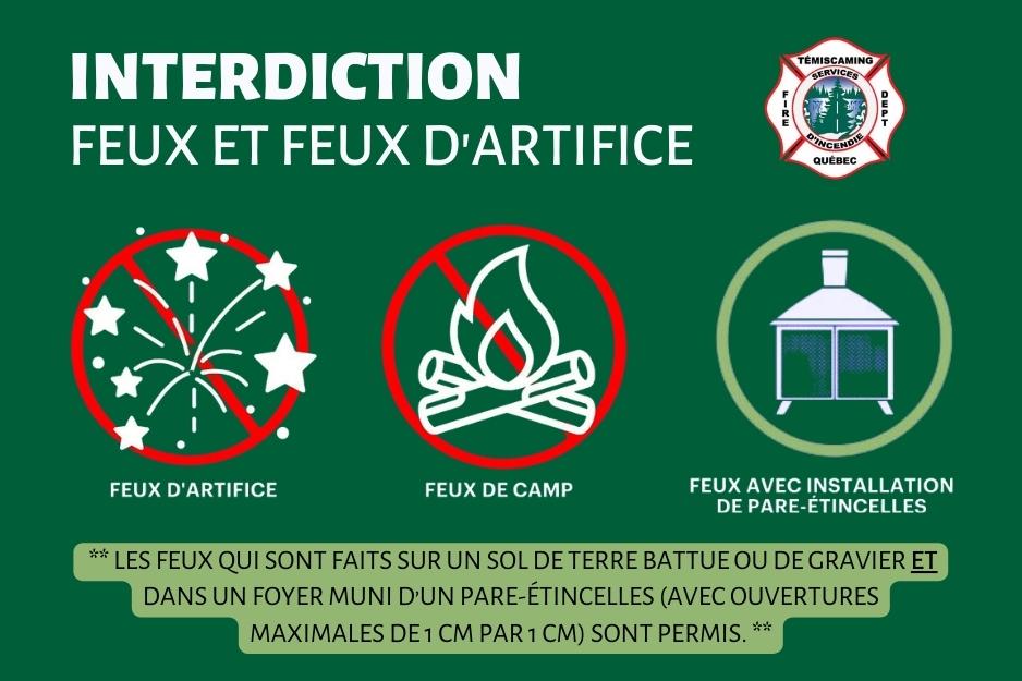 IMPORTANT - Avec les festivités de la Saint-Jean-Baptiste qui auront lieu cette fin de semaine, la Ville de Témiscaming tient à vous rappeler que les feux d'artifice et les feux de camp sont strictement interdits. Nous vous remercions de votre collaboration.