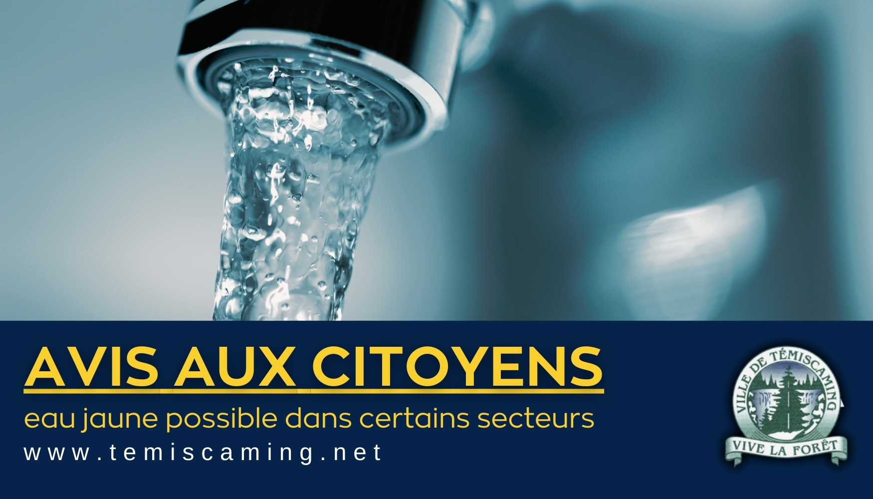 L'eau de votre robinet pourrait présenter une légère décoloration en raison d'une manipulation de bornes d'incendie récente. Pour résoudre ce problème, laissez couler un robinet d'eau froide pendant 5 minutes ou jusqu'à ce que l'eau redevienne claire. Utilisez le robinet le plus proche de l'entrée de la ligne d'eau pour minimiser la décoloration dans votre maison. Si le problème persiste après 24 heures, veuillez nous contacter au 819 627-3273, poste 104.