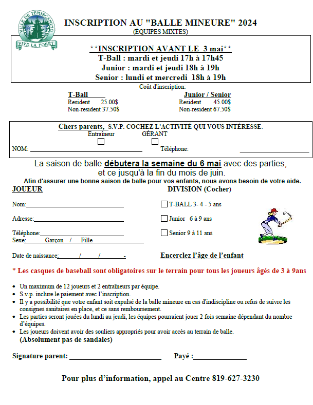 Inscriptions ouvertes! Saisissez l'occasion pour votre enfant de rejoindre l'action du baseball mineur! Inscrivez-vous à la réception du centre avant le 3 mai. La saison commence la semaine du 6 mai jusqu'à fin juin. Ne manquez pas cette chance de participer à une saison excitante!