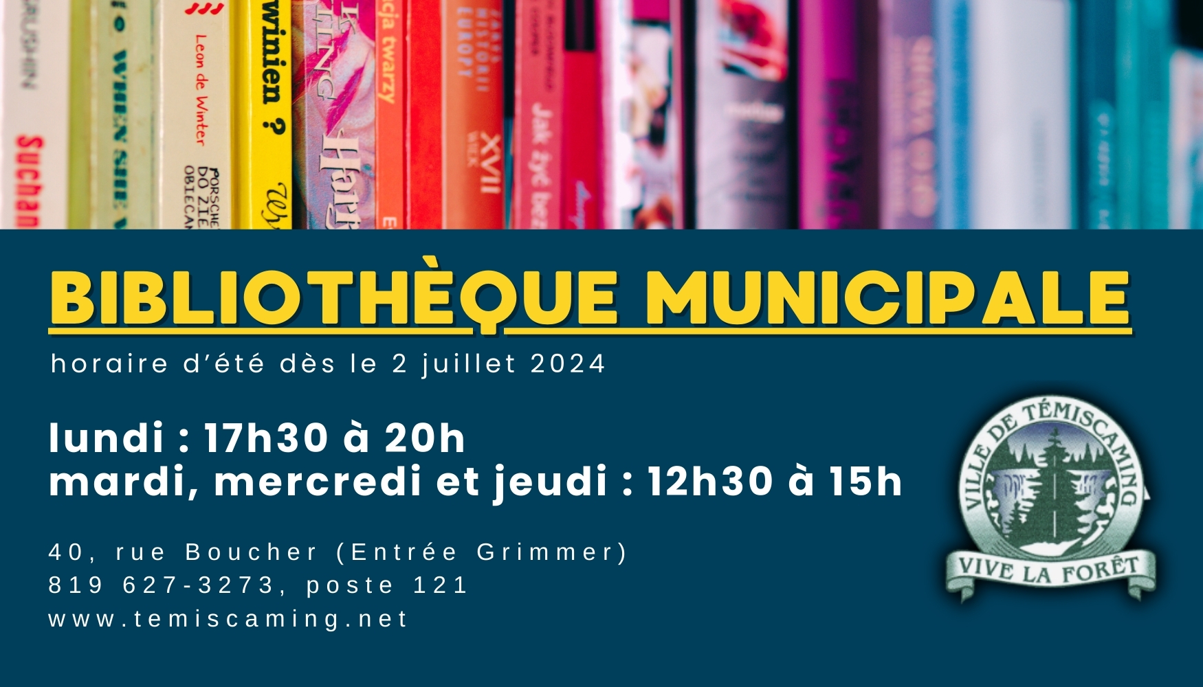 Prendre note que la bibliothèque municipale sera fermée du 24 juin au 1er juillet inclusivement.
