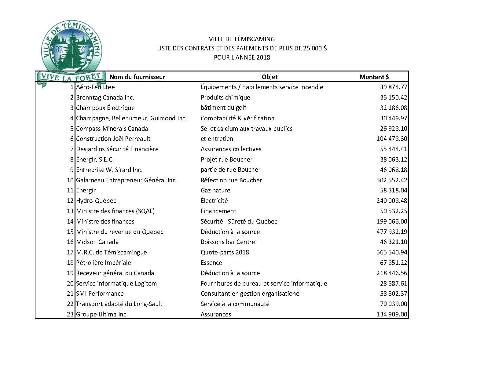 Liste des contrats et des paiements de plus de 25 000$ - 2018