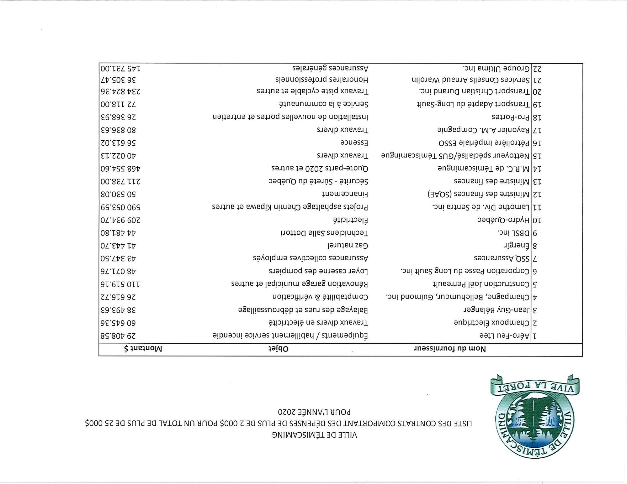 Liste des contrats et des paiements de plus de 25 000$ - 2020
