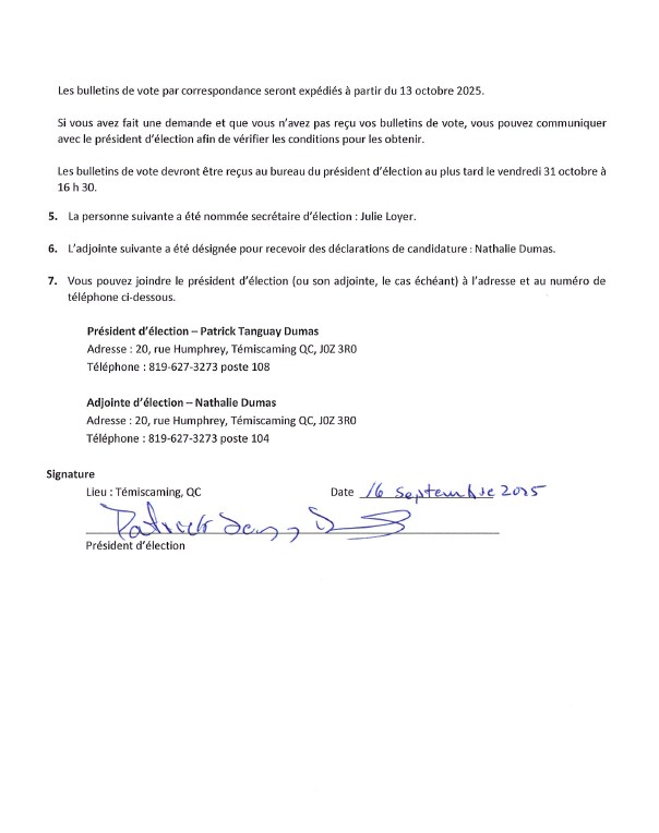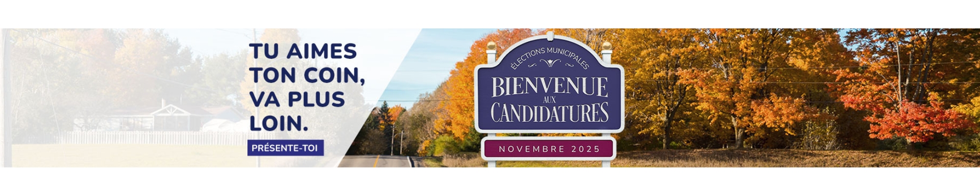 Lors des prochaines élections générales municipales, le 2 novembre 2025, les citoyennes et les citoyens seront invités à élire une mairesse ou un maire ainsi que des conseillères et des conseillers qui veilleront à l'administration et au développement de votre municipalité.