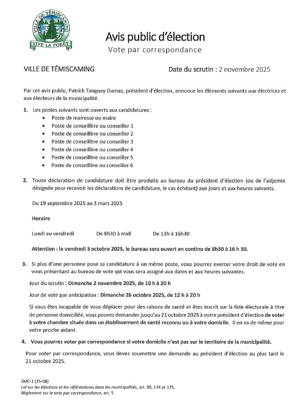 #ÉlectionsMunicipales2025 : Vous songez à poser votre candidature pour un poste au conseil municipal de la Ville de Témiscaming en 2025? Abonnez-vous à l'infolettre du @Ministère des Affaires municipales et de l'Habitation pour rester au courant!