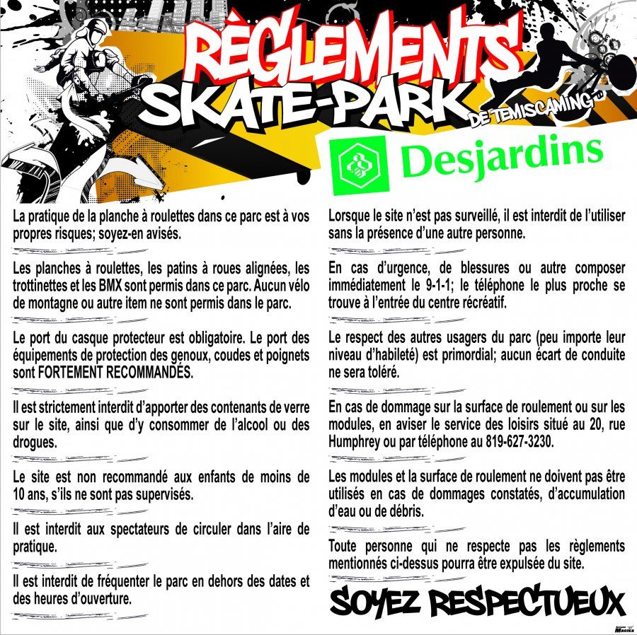 L'aire de planche à roulettes, communément appelée " skatepark ", est un endroit plein air qui a officiellement été ouvert à l'été 2012.
