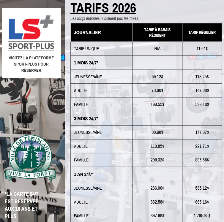 La salle de conditionnement physique est ouverte selon les jours et les heures d'ouverture du Centre récréatif. OPTION 24/7.